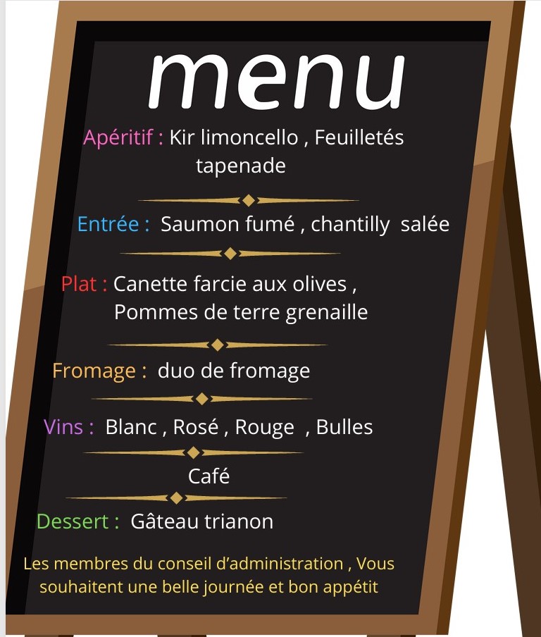 Le menu a été envoyé par mail aux adhérents , et pour ceux qui seraient passés à côté , en voici les grandes lignes : entrée : feuilleté de St Jacques &*&*& en plat : Roti de veau sauce aux cèpes et galette de P.D.T. &*&*& Duo de fromage et salade verte &*&*& en dessert : Trianon , ou tropézienne &*&*& vins rouges et rosé , café …… et bien sûr le sacro-saint apéro , préparé par notre expert en apéritif …..Bernard …!!!